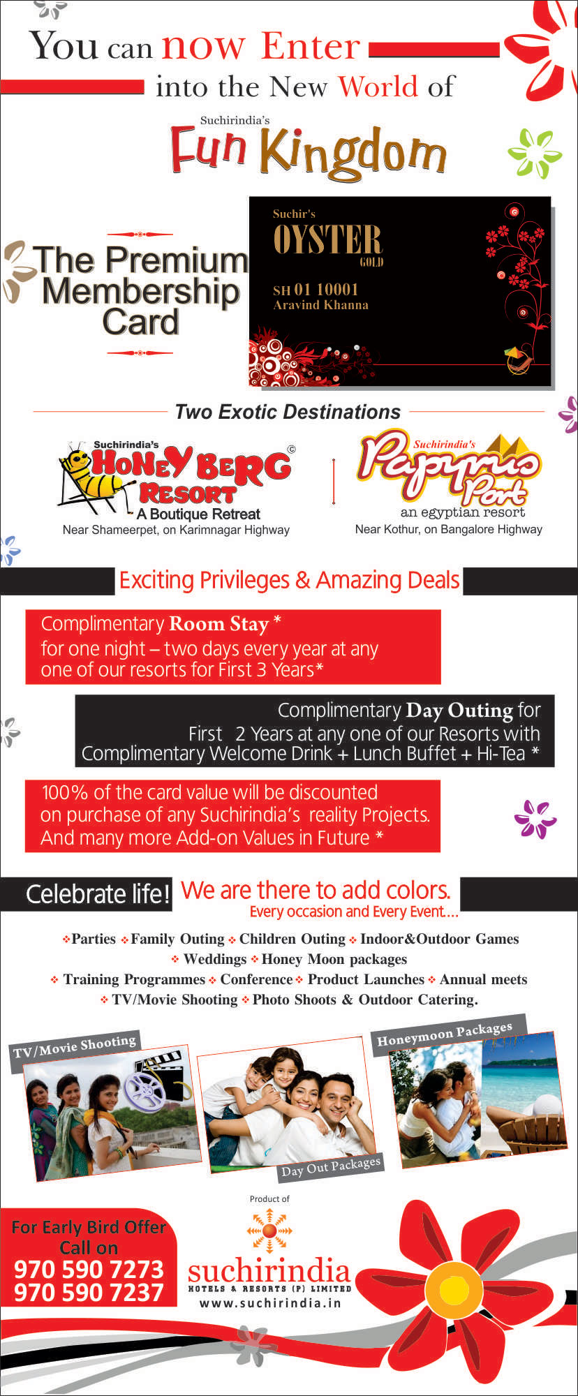 Suchirindia Hotels & Resorts (P) Limited was set up by Suchirindia Group to foray into the hospitality sector. Resorts, Clubs, Theme Parks and other entertainment centers are being set up, initially in and around Hyderabad, major towns of Telanaga., metro cities in India and in due course overseas. Honey Berg is a 40,000 sq.ft, 3 Star boutique retreat located near Genome Valley, Shamirpet, Hyderabad.